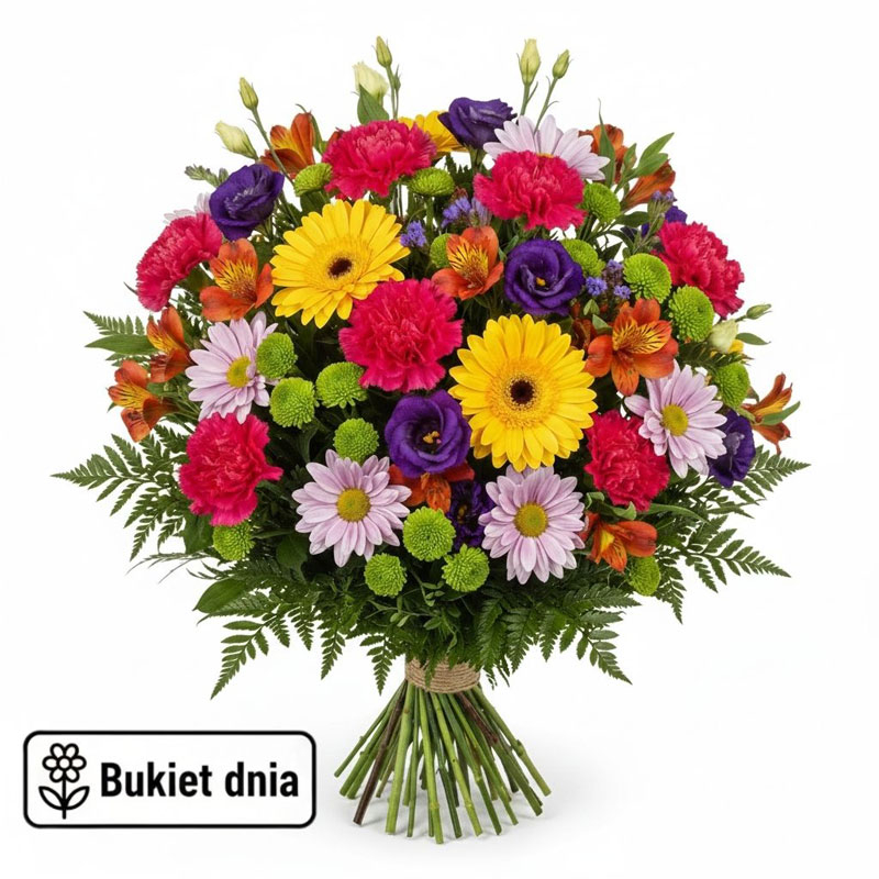 Cztery gatunki w jednym pięknym bukiecie. Eleganckie róże łączą się z promiennymi gerberami, puszystymi goździkami i wdzięcznymi alstromeriami. Każdy kwiat wnosi coś wyjątkowego - omantyzm, optymizm, miękkość i finezję. Kompozycja emanuje spokojem i harmonią! Dodaj bilecik i umil dzień bliskiej osobie.Bukiet Dnia w aliszu to codziennie inna propozycja florystyczna tworzona z aktualnie dostępnych kwiatów. Każda kompozycja przygotowywana jest indywidualnie, z dbałością o detale. Florystka łączy kwiaty sezonowe z całorocznymi, tworząc harmonijny i estetyczny bukiet. To doskonały wybór na prezent z dowolnej okazji. Zamów bukiet z dostawą na terenie Kalisza i spraw radość bliskiej osobie.